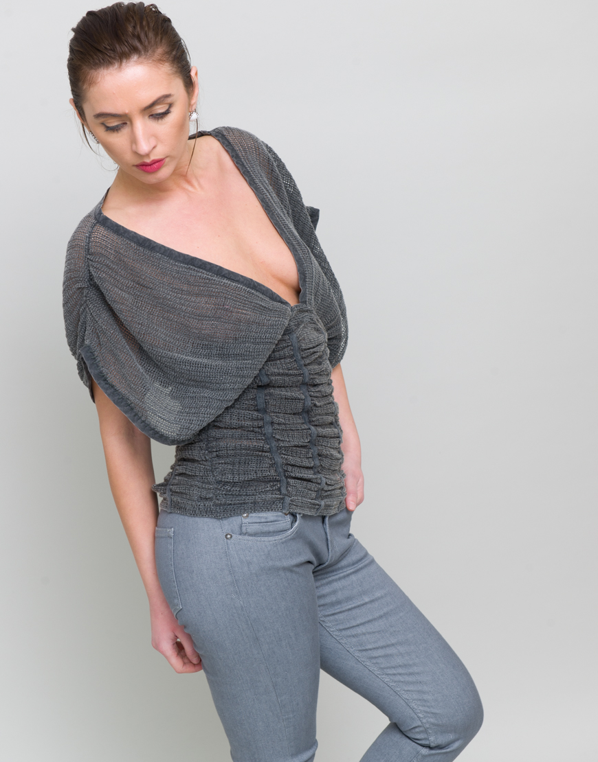 Bluza cu volane. Decolteu in V. Croi lejer in partea de sus si jos mai stramta.