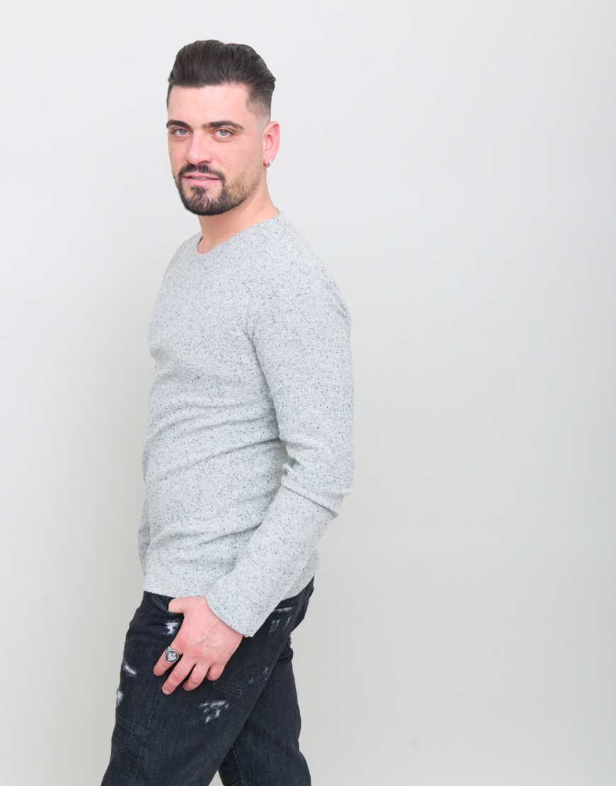 Bluza din amestec de fibra acrilica,lana si matase, cu pete decorative,guler rotund si maneca lunga.