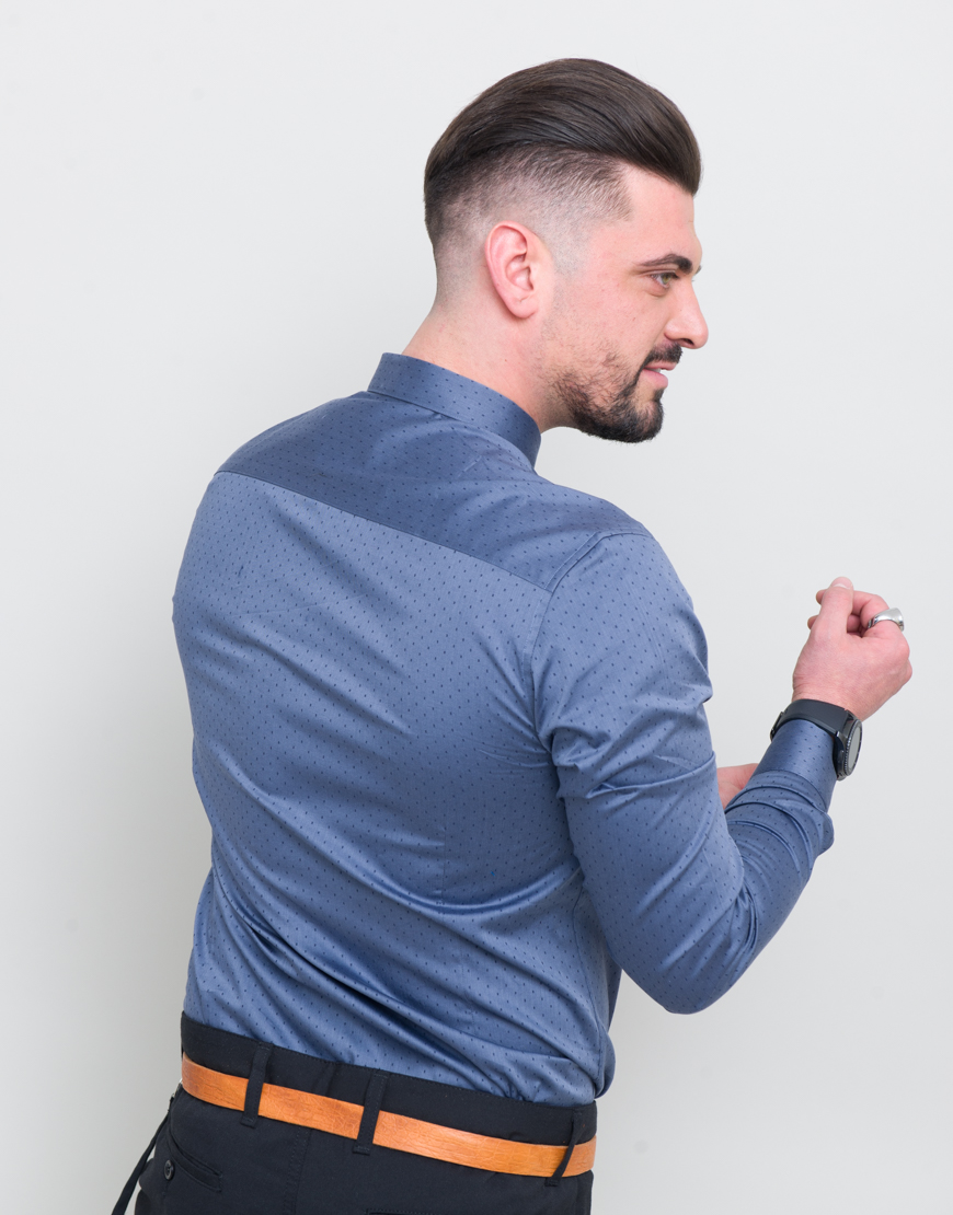 Camasa cu puncte. Croiala dreapta. Maneca lunga. Guler clasic. Inchidere frontala si mansete cu nasturi.
