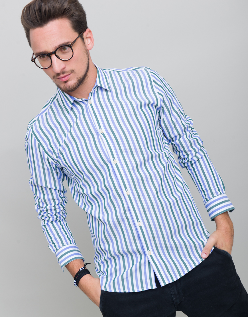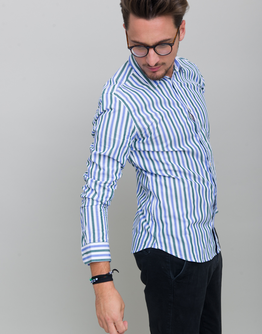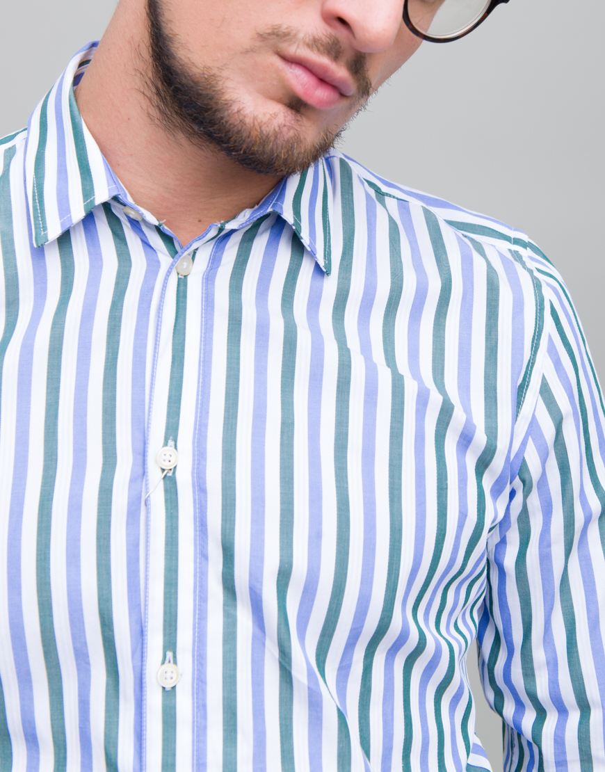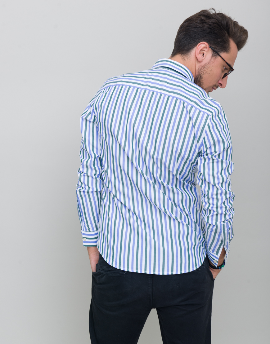 Camasa cu dungi. Croiala dreapta. Maneca lunga. Guler clasic. Mansete incheiate cu nasturi. Inchidere frontala cu nasturi.