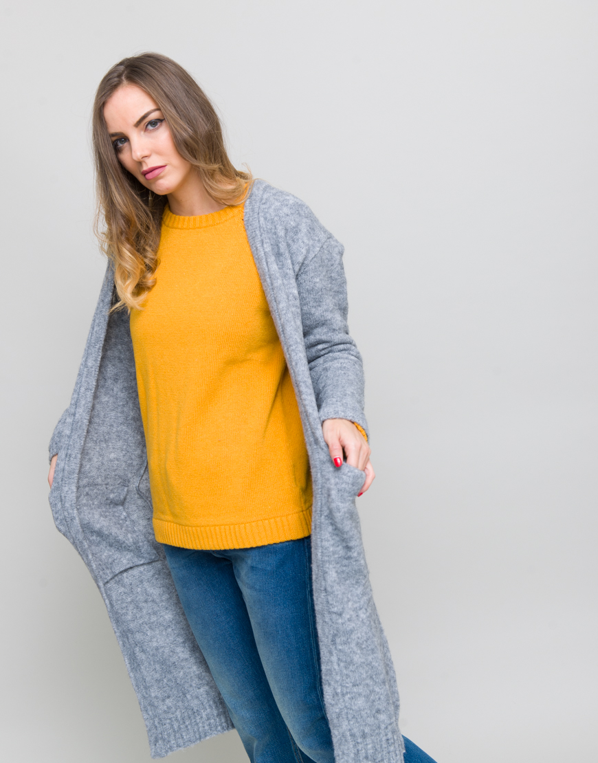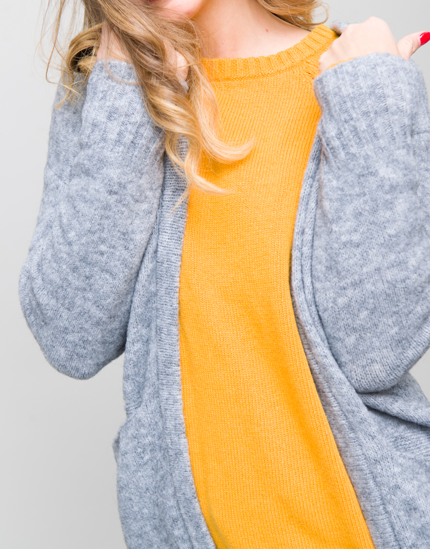 Cardigan pufos. Maneca lunga. Decolteu in V. Buzunare in fata si cu bordura reiata la mansete si la baza.