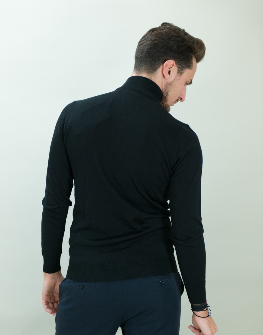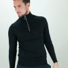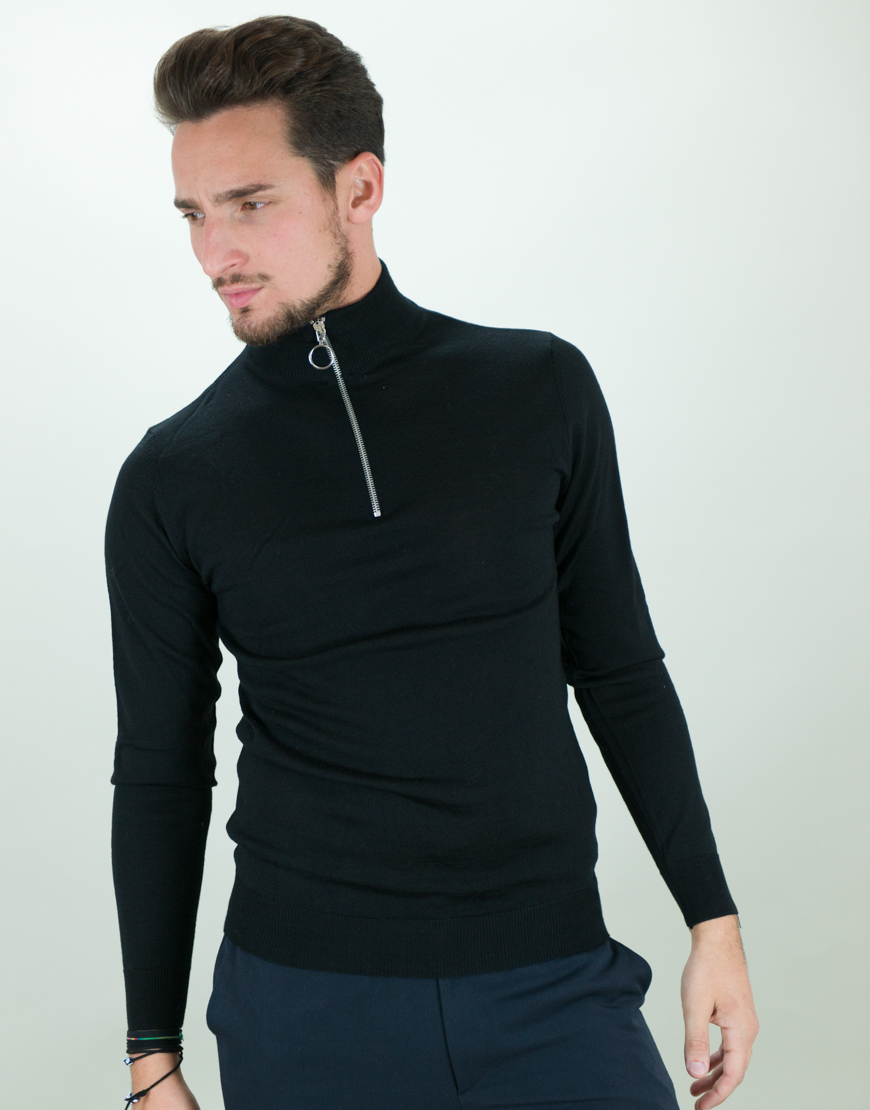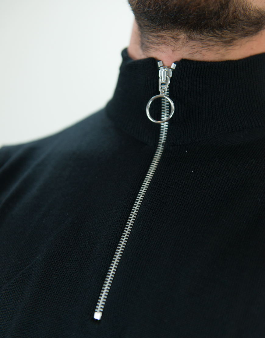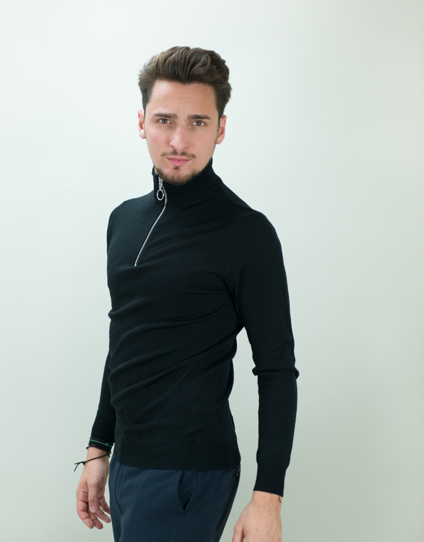 Pulover cu guler inalt reiat. Inchidere cu fermoar in partea de sus. Maneca lunga cu bordura reiată la mansete.