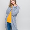 Pulover lung, cu gluga. Maneca lunga. Nasturi in fata. Dungi albastru inchis la baza.