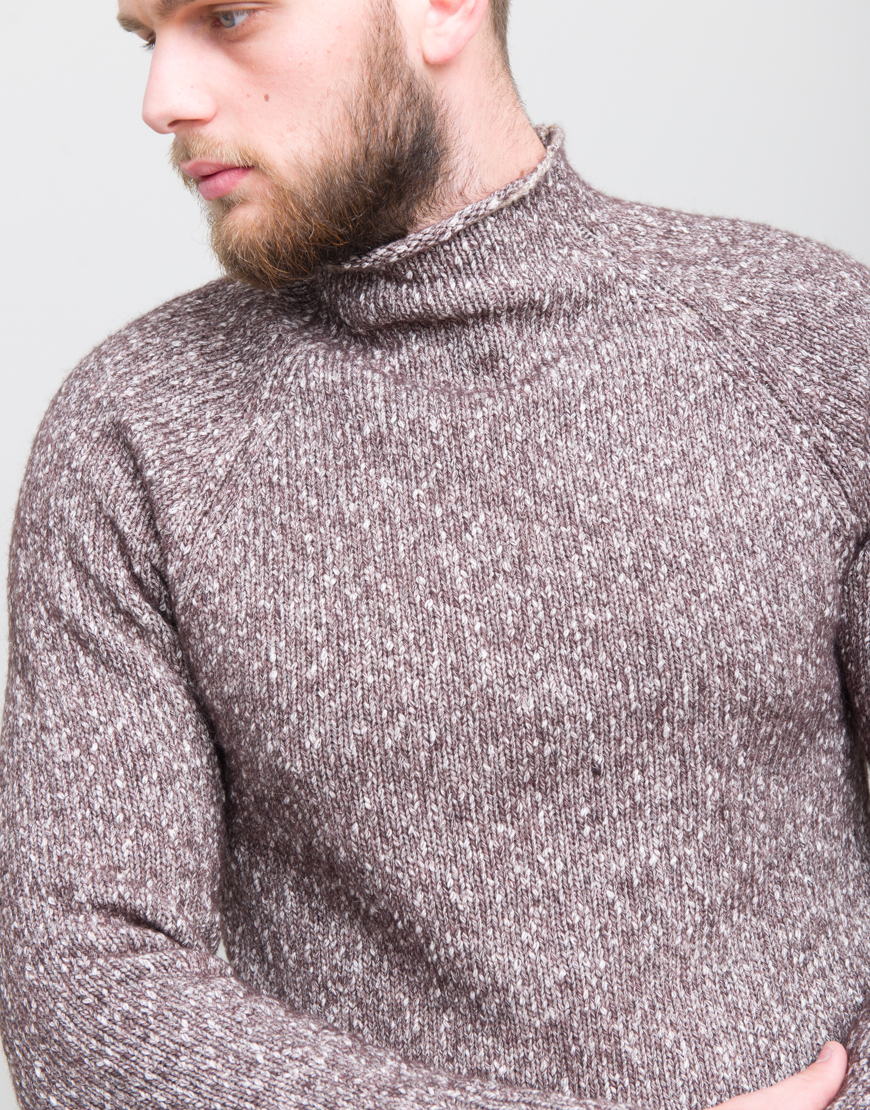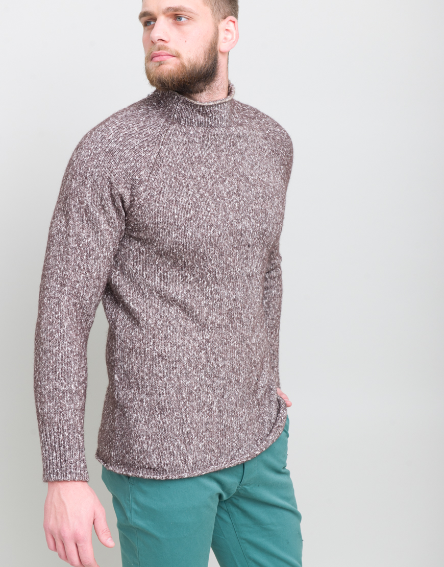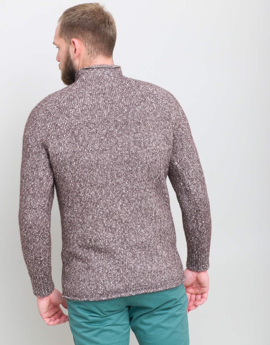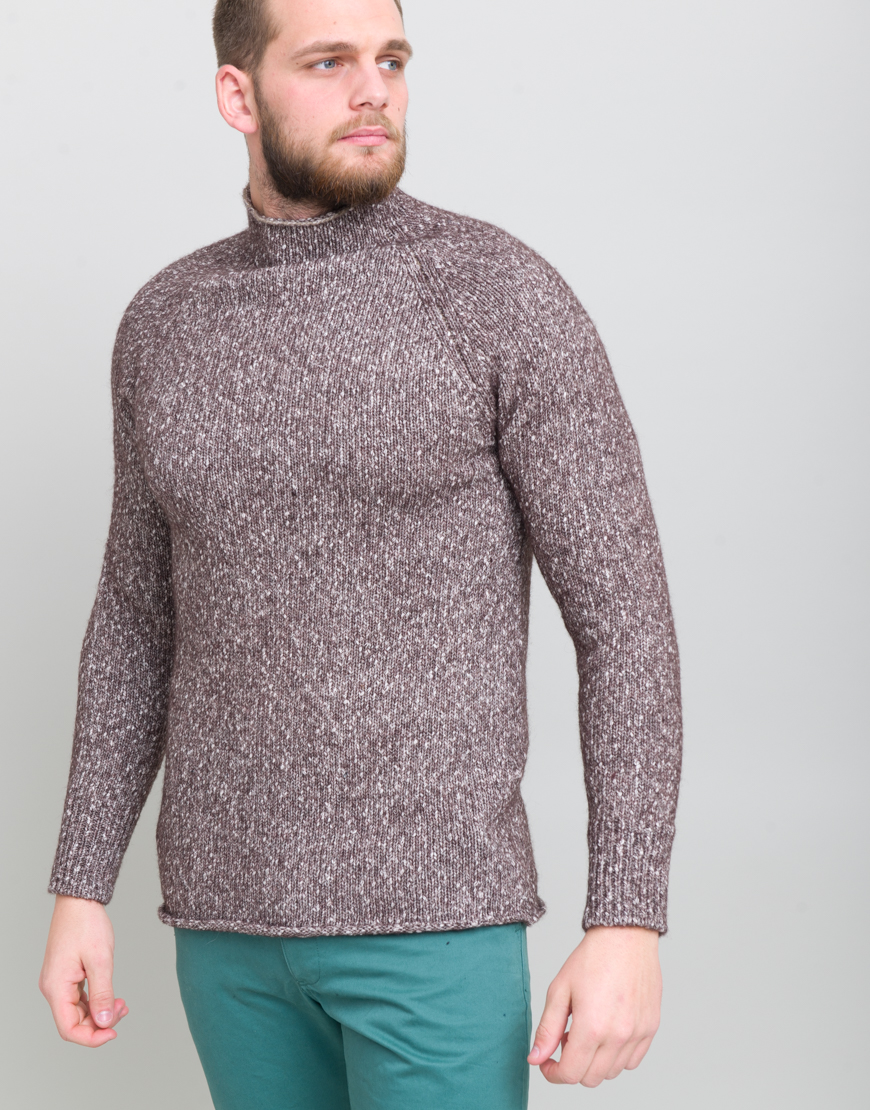 Pulover tricotat, cu maneca lunga, guler rulat si cusaturi intoarse la guler, mansete si la baza.